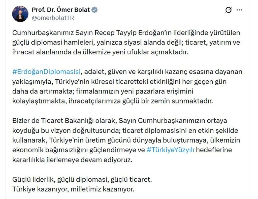 Bakan Bolat, sosyal medya hesabından yaptığı paylaşımda, Erdoğan’ın liderliğinde gerçekleştirilen güçlü diplomatik adımların, yalnızca siyasi arenada değil, ticaret, yatırım ve ihracat alanlarında da ülkemize yeni fırsatlar sunduğunu vurguladı. “Erdoğan diplomasisi, Türkiye’nin uluslararası ticaretteki etkinliğini her geçen gün artırırken, firmalarımızın yeni pazarlara erişimini kolaylaştırmakta ve ihracatçılarımıza önemli avantajlar sağlamaktadır. Ticaret Bakanlığı olarak, Cumhurbaşkanımızın ortaya koyduğu vizyon doğrultusunda ticaret diplomasisini en iyi biçimde kullanarak Türkiye’nin üretim gücünü global piyasa ile buluşturmaya, ekonomik bağımsızlığımızı pekiştirmeye ve Türkiye Yüzyılı hedeflerine kararlılıkla ilerlemeye devam ediyoruz. Güçlü liderlik, etkili diplomasi ve sağlam ticaret ile Türkiye kazanıyor, milletimiz kazanıyor” dedi.